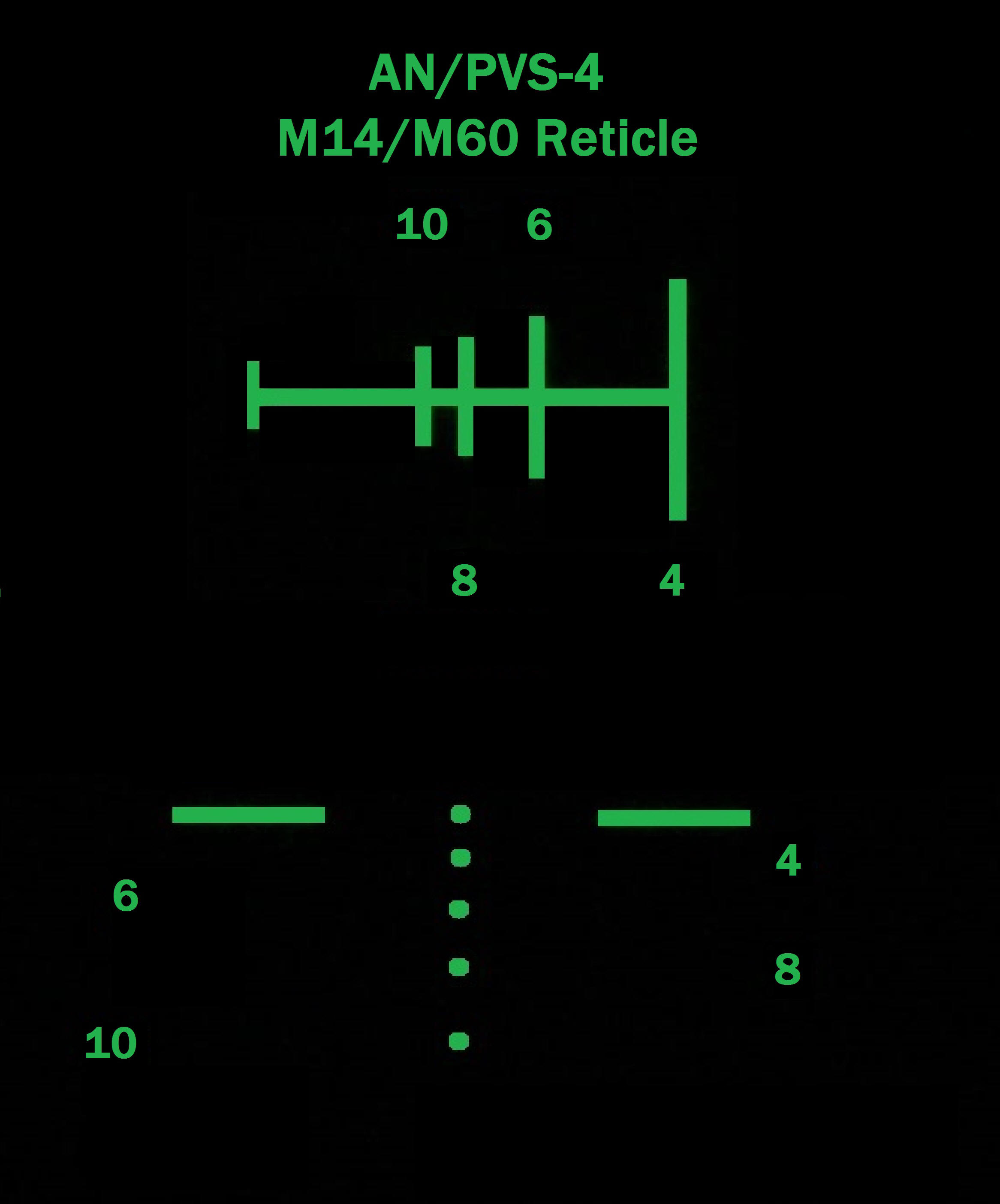 The AN/PVS-4\'s are designed to recover rapidly enough from muzzle flash to allow the user to see the round hit the target and maintain uniform image illumination during changing light levels. The projection-type Reticle is internally adjustable for Windage, Elevation, and Reticle Brightness.